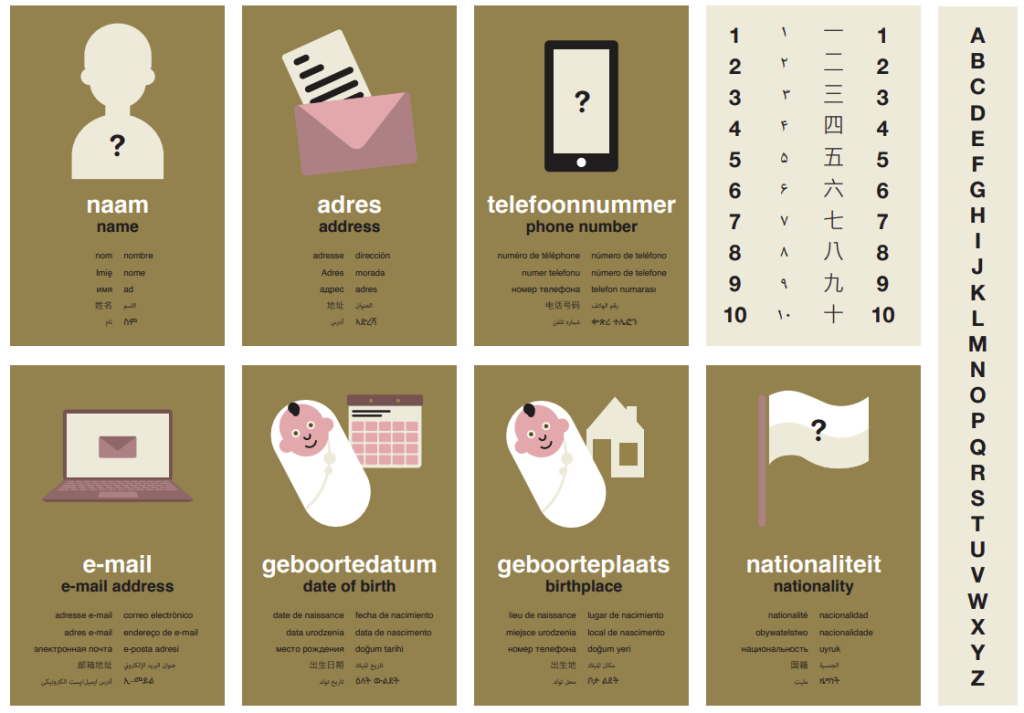 I found more promising ground in the work of the Stichting Lezen en Schrijven (Dutch Reading and Writing Foundation), which developed “counter cards” (baliekaarten). These cards offer pictorial prompts to help low-literate individuals provide essential information—name, date of birth, address—during official interactions. This elegant system inspired an experiment with the community organization SOL in Rotterdam.